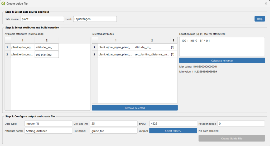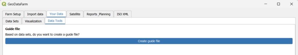In the GeoDataFarm dock widget, scroll down to the Guide file section under the Plan ahead tab. You will see the label “Based on data sets, do you want to create a guide file?” and a button Create guide file. Click it.